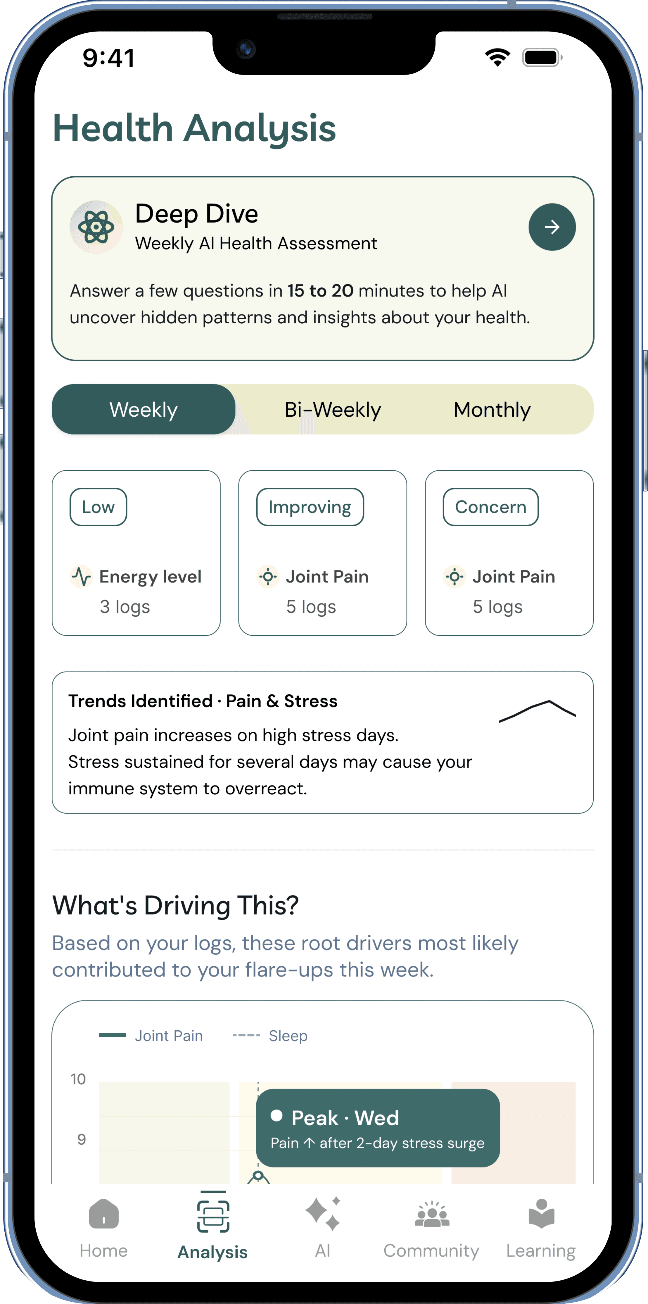Weekly analysis helped users make sense of patterns and prepare for doctor visits.