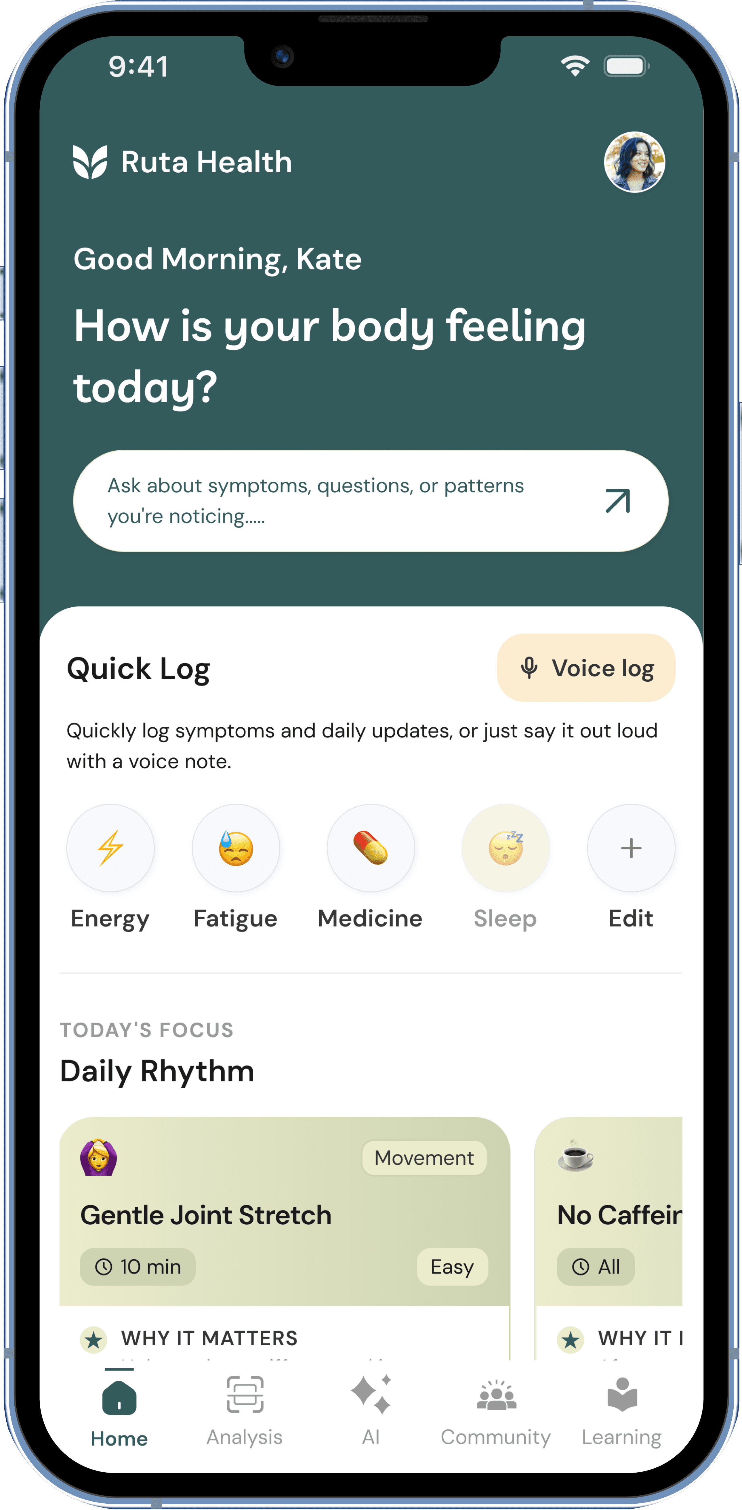 The home screen holds everything a user needs for the day - quick log, daily rhythm tasks, and pattern insights. Learning isn't a generic content library, articles and resources are suggested based on patterns detected in the user's own logs. Community offers groups, trending posts, and peer support, but sharing personal health data is never required. Participation is optional, not a feature gate.