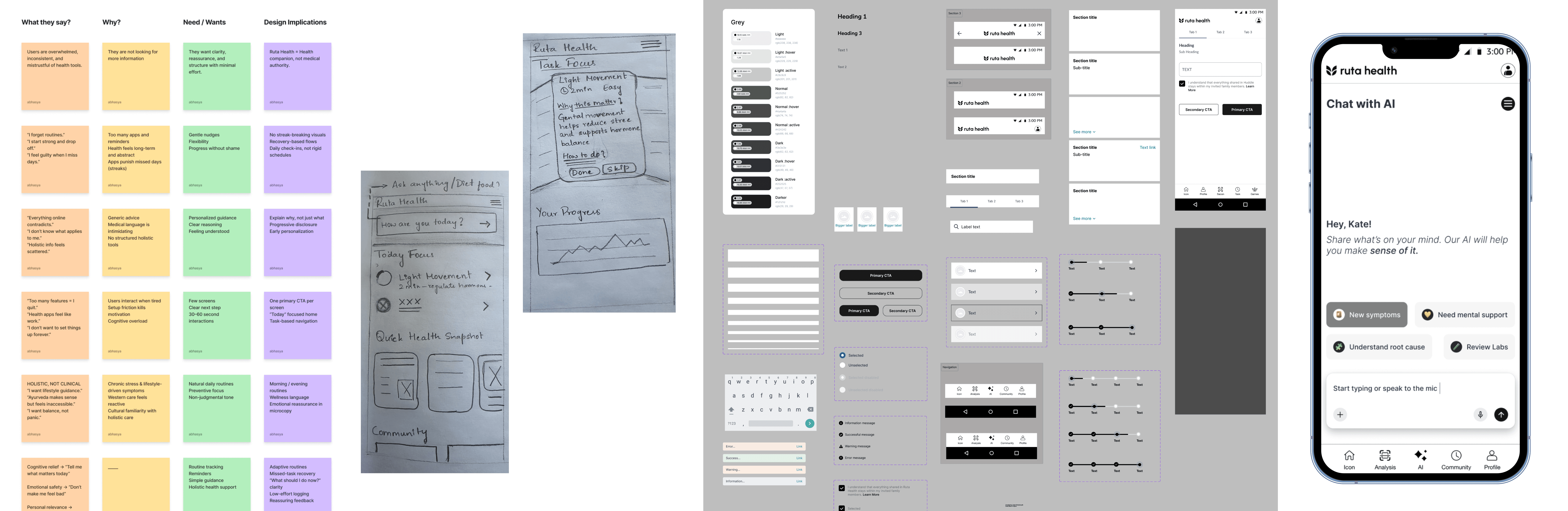 We split the product across four designers. My focus was the foundational layer, the design system everyone built on, the root cause analysis flow, and the first working versions of the home screen and AI chat. Client coordination ran through me throughout the project. Research was a shared effort across all four. Other teammates owned onboarding, learning, and community.